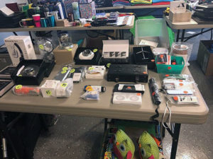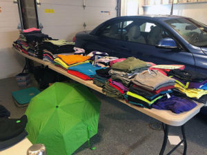 Well, Michele Fausti, along with help from her daughter (Jaci) and sister (Cindy), generated the most organized garage sale imaginable. Numerous weekends were spent folding, hanging, organizing and marking the items for sale ranging from jackets, tees, polos, long sleeve button down shirts, umbrellas, hats, pens, mugs, padfolios, and other useful items.